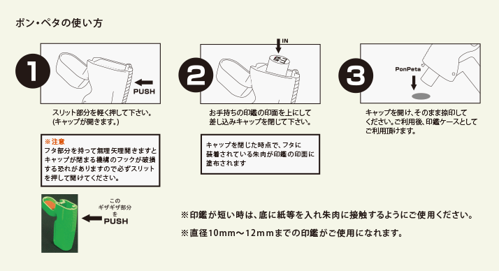 普段お使いの印鑑※をポン・ペタにセットするだけ。ワンタッチでキャップを開き、そのまま捺印でき、机周りが汚れにくい。